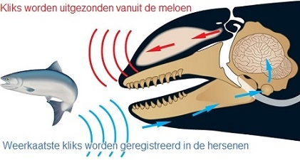 Dolfijnen jagen op vissen met behulp van hun ogen en ook met sonar. Sonar (SOund NAvigation and Ranging) is een techniek die geluid (en de echo daarvan) gebruikt om onder water te navigeren of voorwerpen te ontdekken. Sommige zeedieren, zoals walvissen en dolfijnen, gebruiken echosystemen vergelijkbaar met sonar. Hoe werkt sonar? In de kop van een dolfijn vinden we de zogenaamde 'meloen'. Dit is de bolling boven de kaak en ogen. Dat zou je zijn voorhoofd kunnen noemen. Met deze meloen zendt een dolfijn geluidstrillingen uit, de zogenaamde 'kliks'.