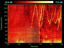 | | Zo ziet het geluid van een dolfijn eruit op een plaatje van een apparaat dat geluidsgolven waarneemt. Iedere dolfijn heeft zijn eigen unieke plaatje, net als de vingerafdruk van een mens. |